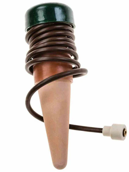 Stecken Sie den Tonkegel einfach in den Blumentopf und füllen ihn einmalig mit Wasser. Danach zieht der Kegel kontinuierlich Wasser aus einem Vorratsbehälter und gibt die Feuchtigkeit an die umgebende trockene Erde im Pflanzgefäss ab.