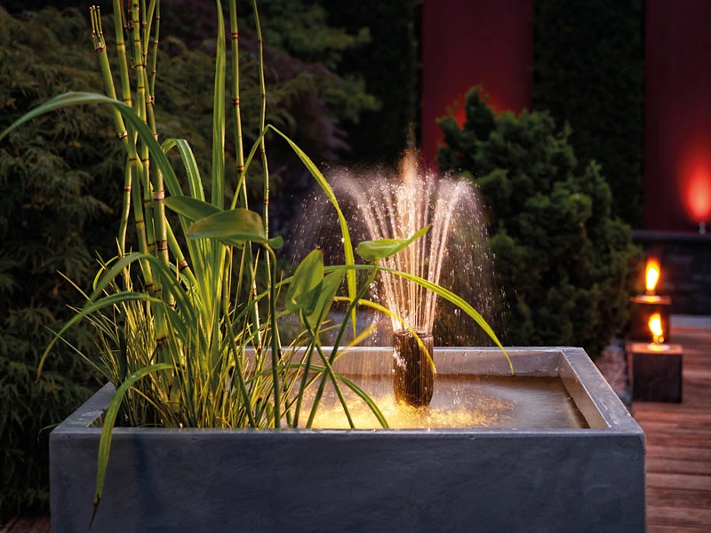 Durch einen regulierbaren zweiten Pumpenabgang (1/2″) ist der gleichzeitige Betrieb einer Fontäne und eines weiteren Wasserspiels möglich. Optional ist ein Blüfterset als Zubehör erhältlich.