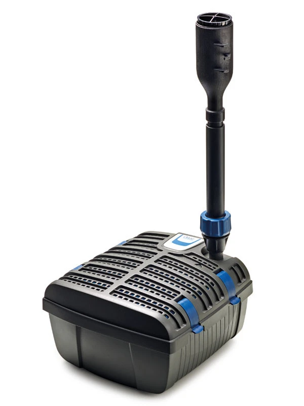 Der Unterwasserfilter ermöglicht gleichzeitig den Betrieb einer Fontäne. Das Teichwasser wird biologisch-mechanisch gereinigt, wobei 8 mm große Filterschlitze die Aufnahme auch grober Schmutzpartikel sicherstellen. Das integrierte UVC-Vorklärgerät sorgt für eine Bekämpfung von Grünalgen sowie krankheitserregender Bakterien und Keime.