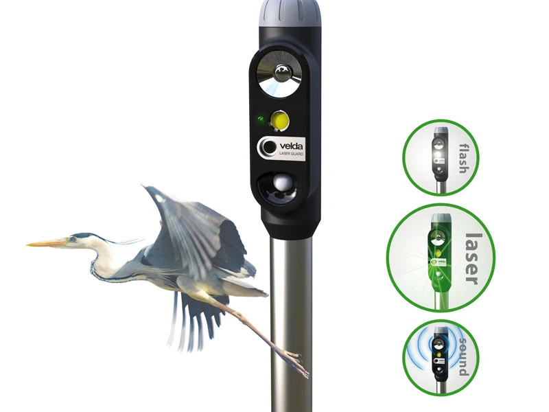 Der Bewegungssensor des Laser Guard detektiert herannahende Eindringlinge und gibt direkt grelle Lichtblitze, grüne Laserstrahlen und optional auch abschreckende Geräusche. Er hat eine Reichweite von ca. 12 m in einem Winkel von 100°. Noch bevor der Reiher am Teichufer landet wird er erschrocken fliehen und sind die Fische im Teich sicher. Die Wirkung des Laser Guard ist sehr effektiv gegen Reiher auf drei verschiedene Arten: