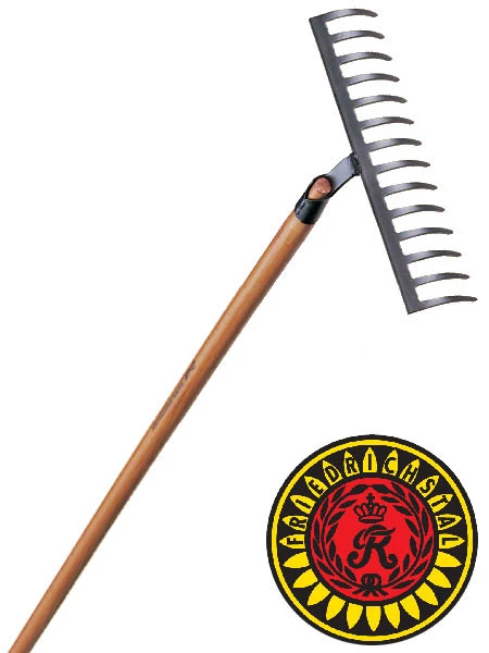 Rechen mit 14 Zinken, zur gleichmäßigen Verteilung und Zerkrümelung der Erde, zur Pflege und Bearbeitung von Rabatten und Beeten. Hochwertiger Eschenstiel (Länge: 160 cm), geschmiedeter Stahl, Gewicht 1500 g.