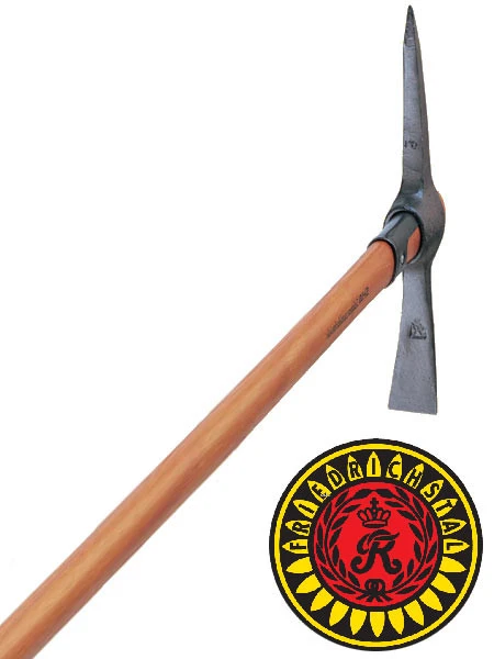 Kreuzhacke mit Vierkantspitze und Hacke 50 mm breit, für grobe Arbeiten in harten und festen Böden. Hochwertiger Eschenholzstiel