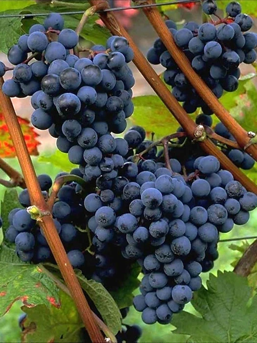 | Frucht: | Blaue bis blauschwarze, mit großen Beeren besetzte sehr große Trauben; säure- und zuckerreich, intensive Farbe. |