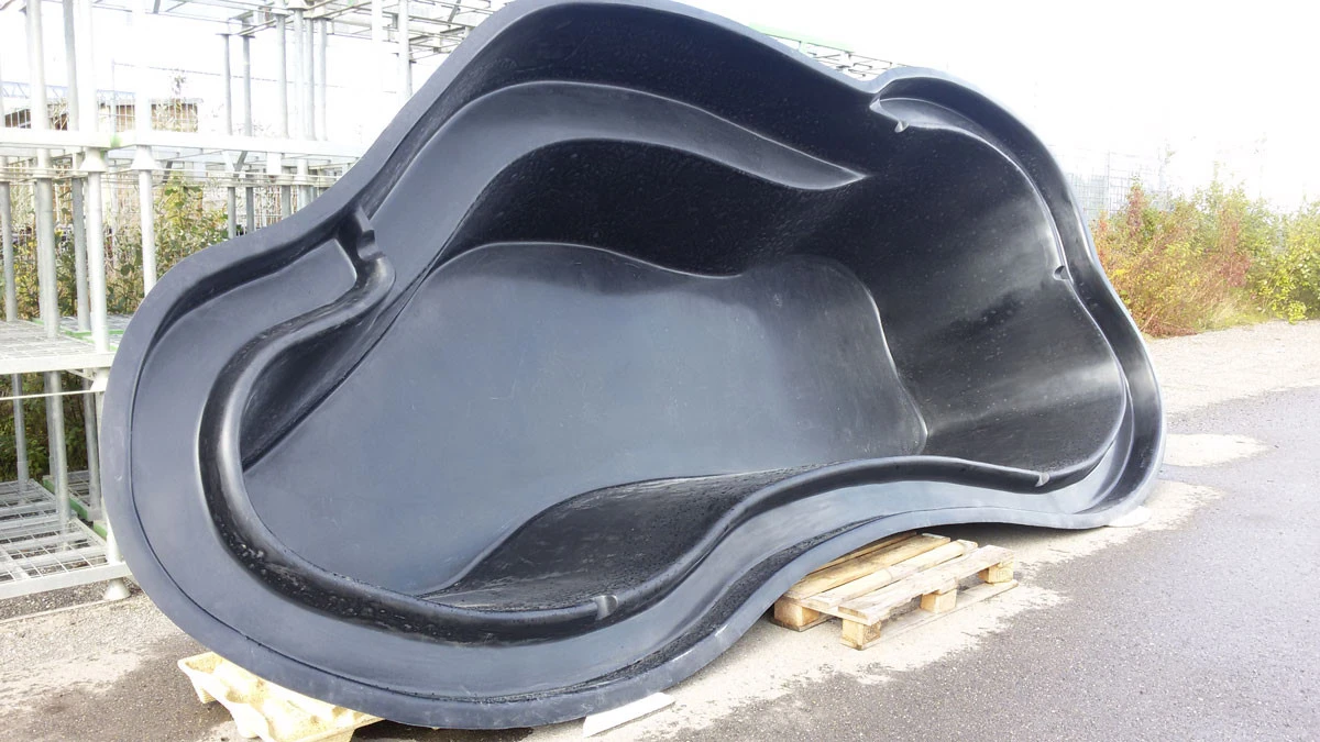Teichbecken aus glasfaserverstärktem Polyester, hergestellt im Handauflegeverfahren – daher frostbeständig, verrottungsfest und UV-beständig. Mit nahezu unbegrenzter Lebensdauer.