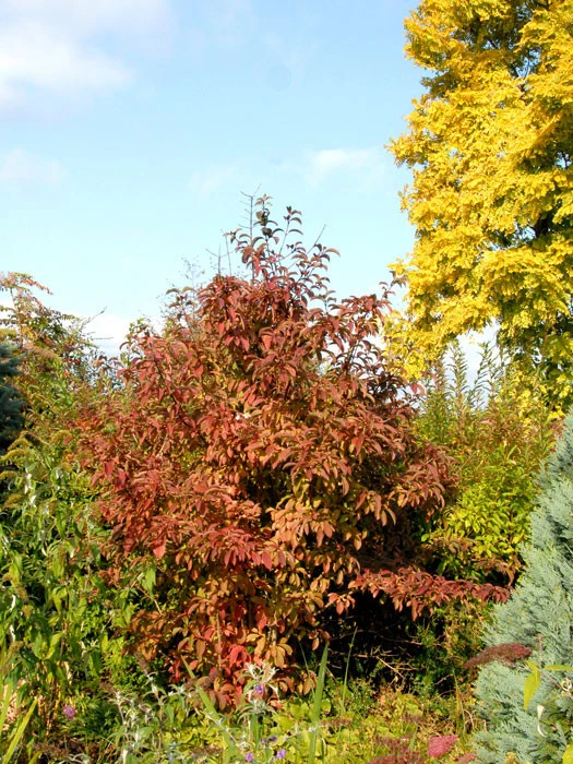 | Blatt, Holz: | Elliptische, geaderte bis runzlige, mittelgrüne Blätter, 5 – 10 cm groß, mit rotem Stiel. Herbstfärbung rot bis violett. Holz dunkelbraun mit im Austrieb rötlichen Knospen. |